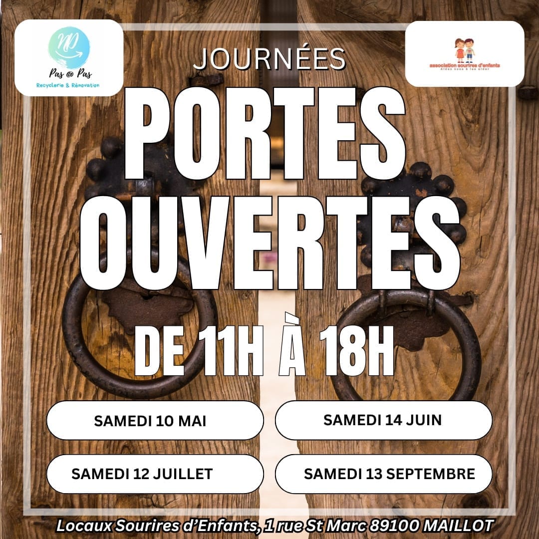 Nous sommes heureux de vous inviter à nos journées portes ouvertes, avec un parcours à l’intérieur comme à l’extérieur de notre association Sourires d’enfants ! Venez découvrir la recyclerie de Nathalie Pas À Pas !!